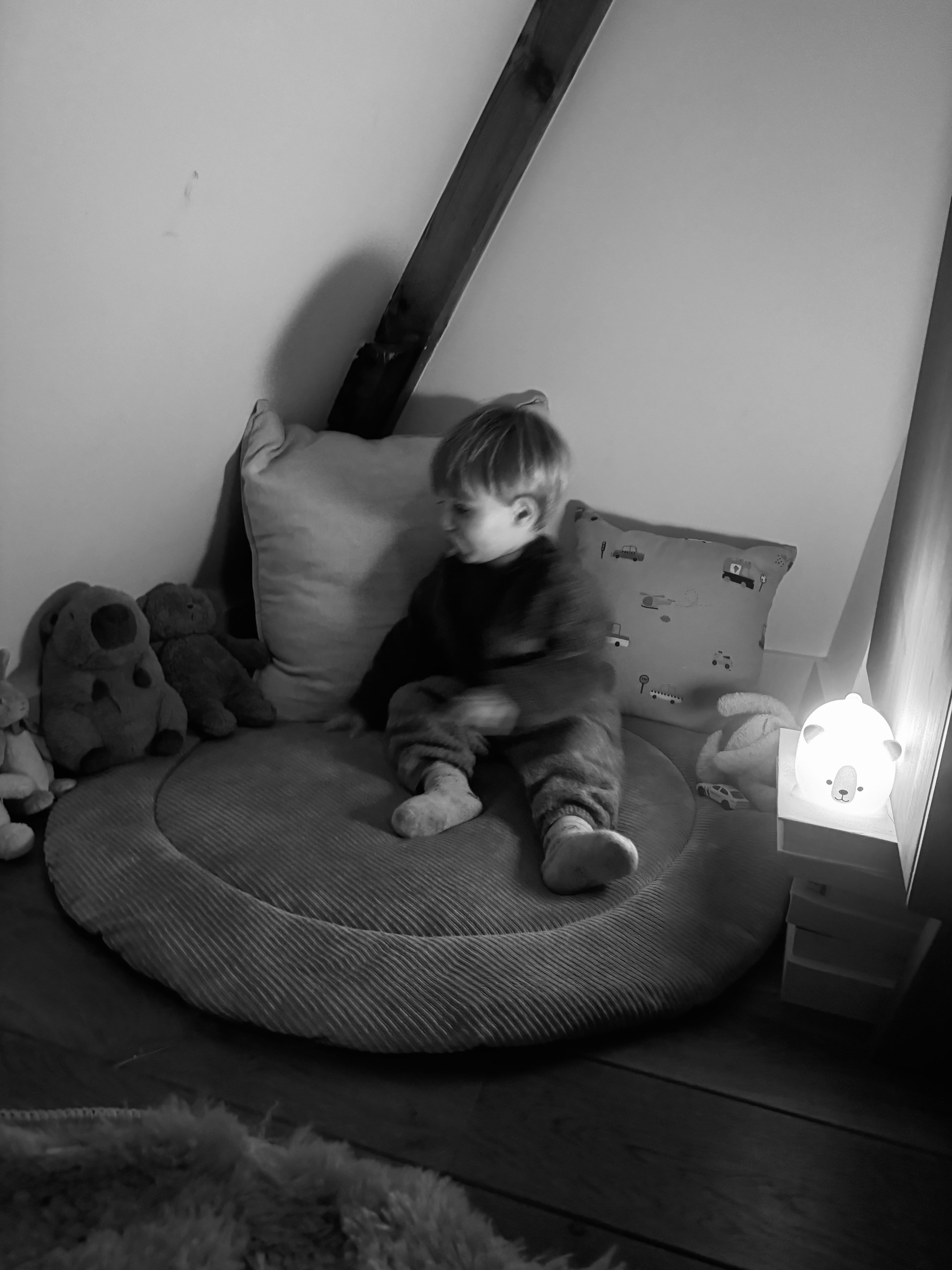 There’s a new reading corner in the house. In the nook where the ceiling slopes into an attic, sheltered by wooden beams from the Dutch winter cold. Guarded by a bear, a zebra, a capybara and a fire truck.